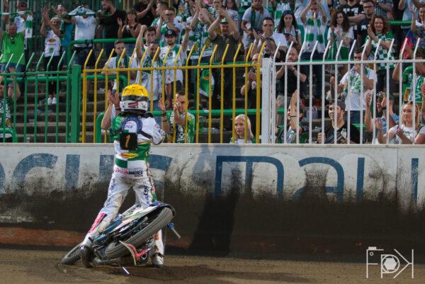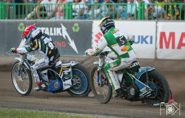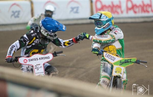 STELMET Falubaz Zielona Góra od wewnątrz, a forBET Włókniarz Częstochowa po bandzie. Michael Jepsen Jensen gubi prędkość i traci pozycje dwukrotnie na własne życzenie. Fredrik Lindgren napędzał się, ale Dudek był wyraźnie szybszy.
