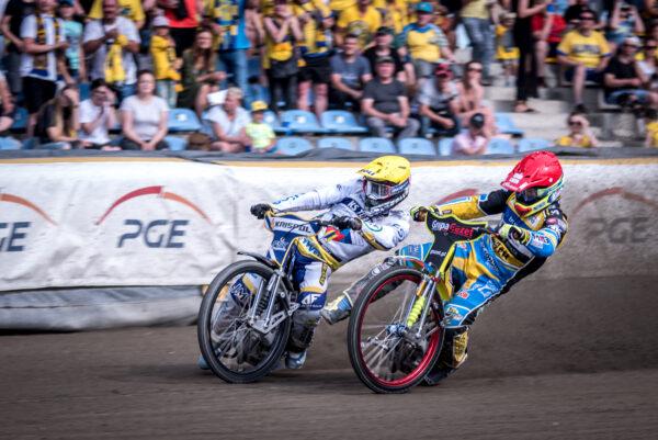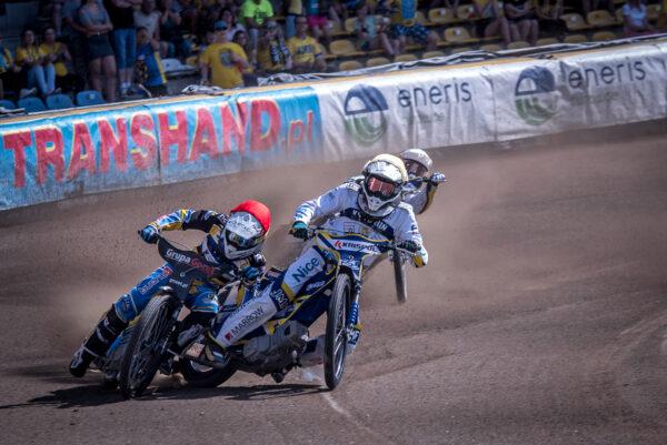 Moment startowy należał do Kościucha, ale na wyjściu z pierwszego łuku odszedł od krawężnika i wykorzystał to Bartosz Zmarzlik. Na dystansie ogromna przewaga Zmarzlika nad parą Get Well Toruń.