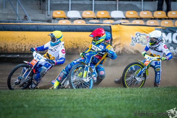 Najlepiej ze startu goście z Leszna. Szymon Szlauderbach na szczycie drugiego łuku za mocno wykontrował motocykl i upadł na tor. Junior gości szybko wstał i bieg mógł być kontynuowany. Pewne zwycięstwo Kołodzieja