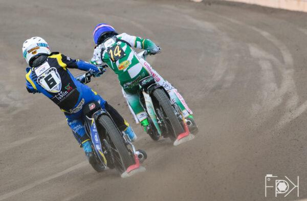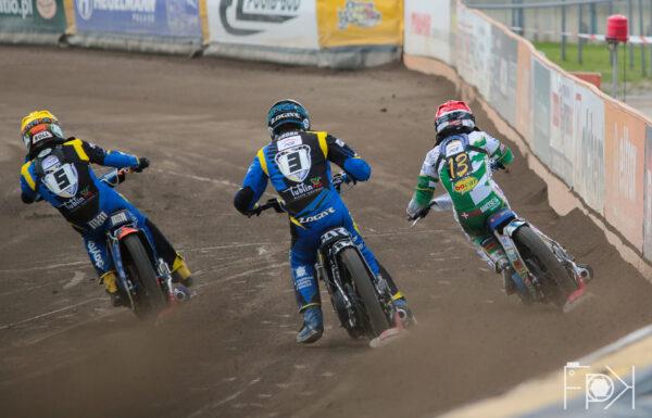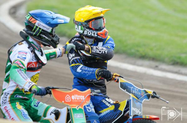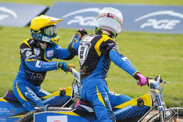 Najlepiej ze startu Wiktor Lampart, ale po szerokiej mocno napędził się Mateusz Świdnicki, który po wyjściu z pierwszego łuku wyprzedził Wiktora Lamparta. Lublinianin próbował naciskać na Świdnickiego, ale kolejność w tym biegu już nie uległa zmianie. Na trzeciej pozycji linię mety przekroczył Viktor Trofymov. Mamy pierwszy remis w spotkaniu,