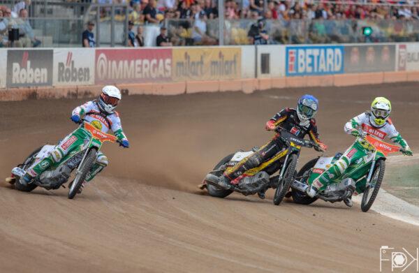 Znakomity start Kacpra Woryna z niekorzystnego dzisiaj pola drugiego, ale po zewnętrznej rozpędził się Artem Laguta, który szybko objął prowadzenie. Za Rosjaninem usadowiła się para gości. Bieg na remis.