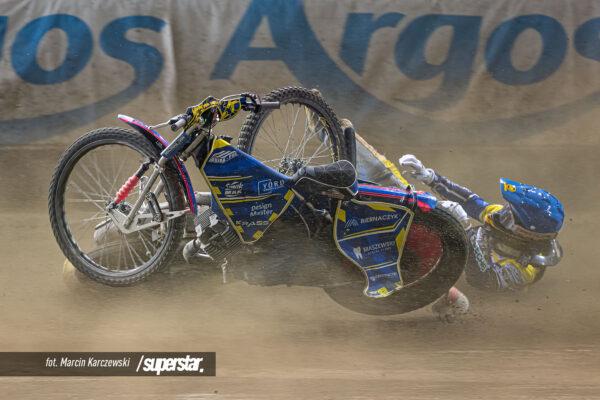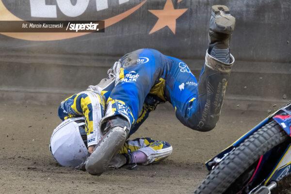 Ciasno na wejściu w pierwszy łuk. Szymon Woźniak zakładał się do krawężnika, na nim pociągnęło Pawlickiego, którego postawiło i z impetem wpadł w dmuchane bandy. Żużlowiec z Grudziądza wstał o własnych siłach i udał się do parku maszyn.