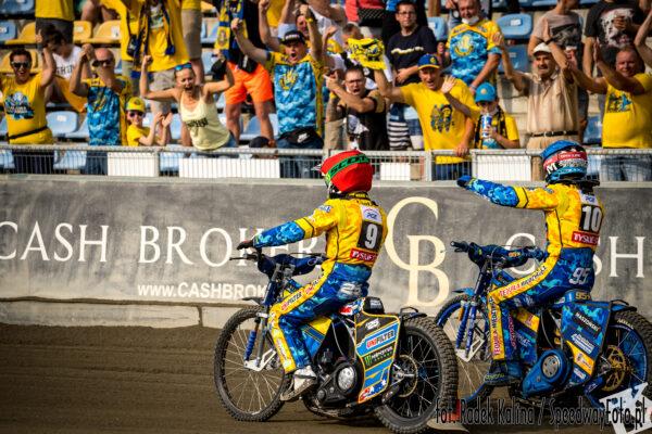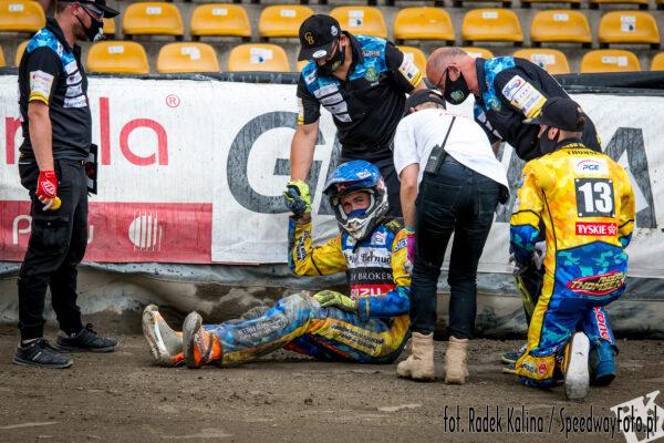 Ciasno na pierwszym łuku. Zmarzlik delikatnie wywiózł pod bandę Lagutę i gospodarze objęli podwójne prowadzenie. Na dystansie uciekł do przodu Zmarzlik. Na wyjściu z ostatniego łuku Laguta wszedł pod łokieć Holdera i ten z impetem upadł na tor
