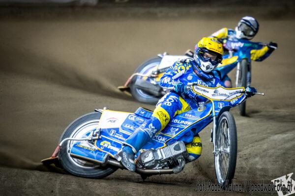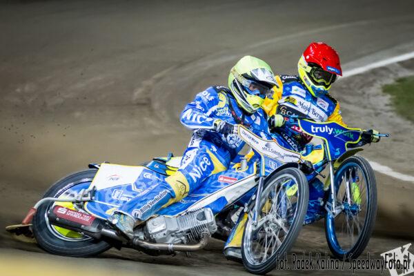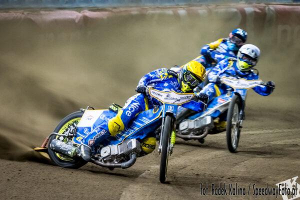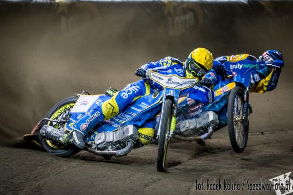 Laguta wykorzystał na starcie pierwsze pole. Po szerokiej napędził się na pierwszym łuku Bjerre i goście wyszli na podwójne prowadzenie. Na dystansie szalał Zmarzlik, ale skutecznie przed tymi atakami bronił się Duńczyk. Ogromna przewaga na mecie Laguty