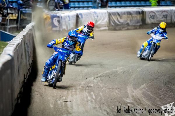 Wykorzystał na starcie pierwsze pole Woźniak. Na wyjściu z pierwszego łuku dołączył do niego Kasprzak. W pogoń za KK ruszyli Pawlicki i Bjerre, ale zawodnik gorzowskiej Stali obronił dwa punkty, które dają podwójne prowadzenie gospodarzy.