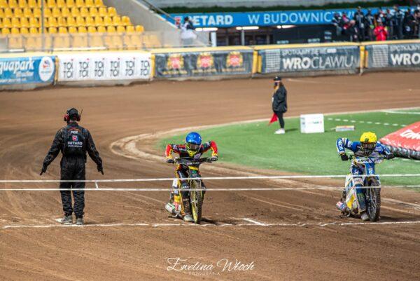 Jack Holder wygrał start, ale na przeciwległej prostej podniosło jego motocykl, co momentalnie wykorzystali gospodarze. Wydawało się, że zawodnicy BETARD Sparty dowiozą do mety podwójny triumf, lecz pod koniec trzeciego okrążenia Curzytek powtórzył błąd Holdera. Australijczyk wjechał pod lewy łokieć wrocławianina i choć junior gospodarzy próbował odzyskać dwa punkty, to przegrał o pół długości motocykla. Pewny triumf Laguty.