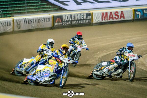 Zawodnicy drużyny gości blokują gospodarzy na pierwszym wirażu. Na ostatniej prostej Patryk Dudek ledwo broni 2 miejsce.