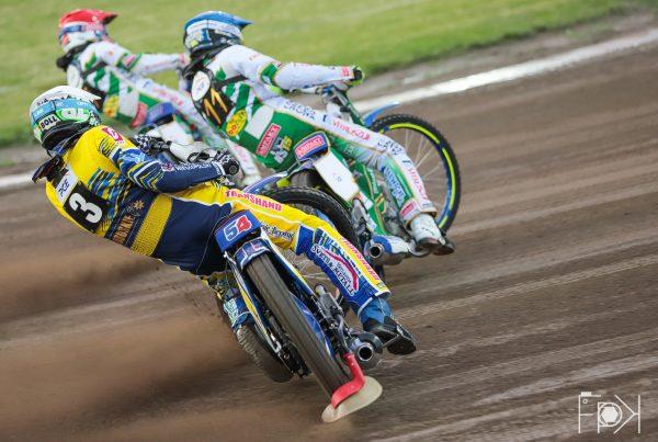 Trzecia odsłona dzisiejszego wieczora przyniósł spodziewane emocje. Po dwóch okrążeniach zawodnicy jechali wciąż bardzo blisko siebie, jednak Bartosz Zmarzlik odjechał na trzecim kółku zdecydowanie od goniącego go Fredrika Lindgrena i pewnie wygrał. Jako, że Anders Thomsen przyjechał na trzecim miejscu, goście odnieśli pierwsze zwycięstwo biegowe w dniu dzisiejszym.