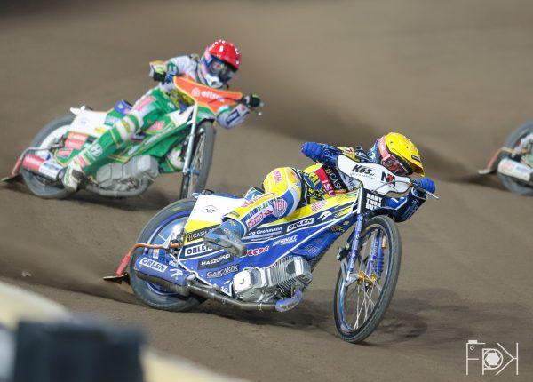 Inauguracyjny wyścig dzisiejszego spotkania rozpoczął się od dobrego startu gospodarzy jednak na wyjściu z pierwszego łuku para gości wyprzedziła Bartosza Smektałę. Na pierwszym miejscu z dużą przewagą linie mety minął Leon Madsen. Zaczynamy zawody od remisu biegowego.