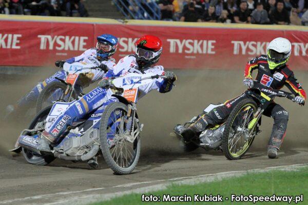 Fantastyczny wyścig i pokaz drużynowej jazdy w wykonaniu leszczynian. Emil Sayfutdinov i Jason Doyle na zmianę blokowali Taia Woffindena, raz przy krawężniku, a raz przy bandzie. Brytyjczyk wychodził z siebie, ale nie zdołał znaleźć recepty na przebicie australijsko-rosyjskiej ściany.